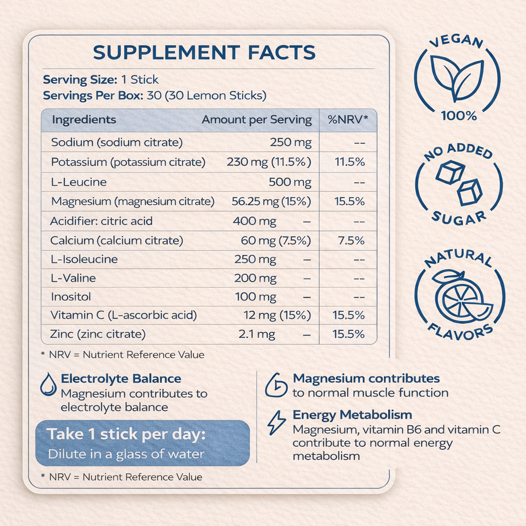 Performance+ is a BCAA-powered hydration formula made to support muscles, hydration, and physical performance. It combines branched-chain amino acids, electrolytes, vitamins, and minerals to help your body stay strong, energized, and well hydrated during exercise and daily activities. With a refreshing natural lemon taste and a clean, sugar-free formula, it is designed to make hydration simple and effective. 💧⚡